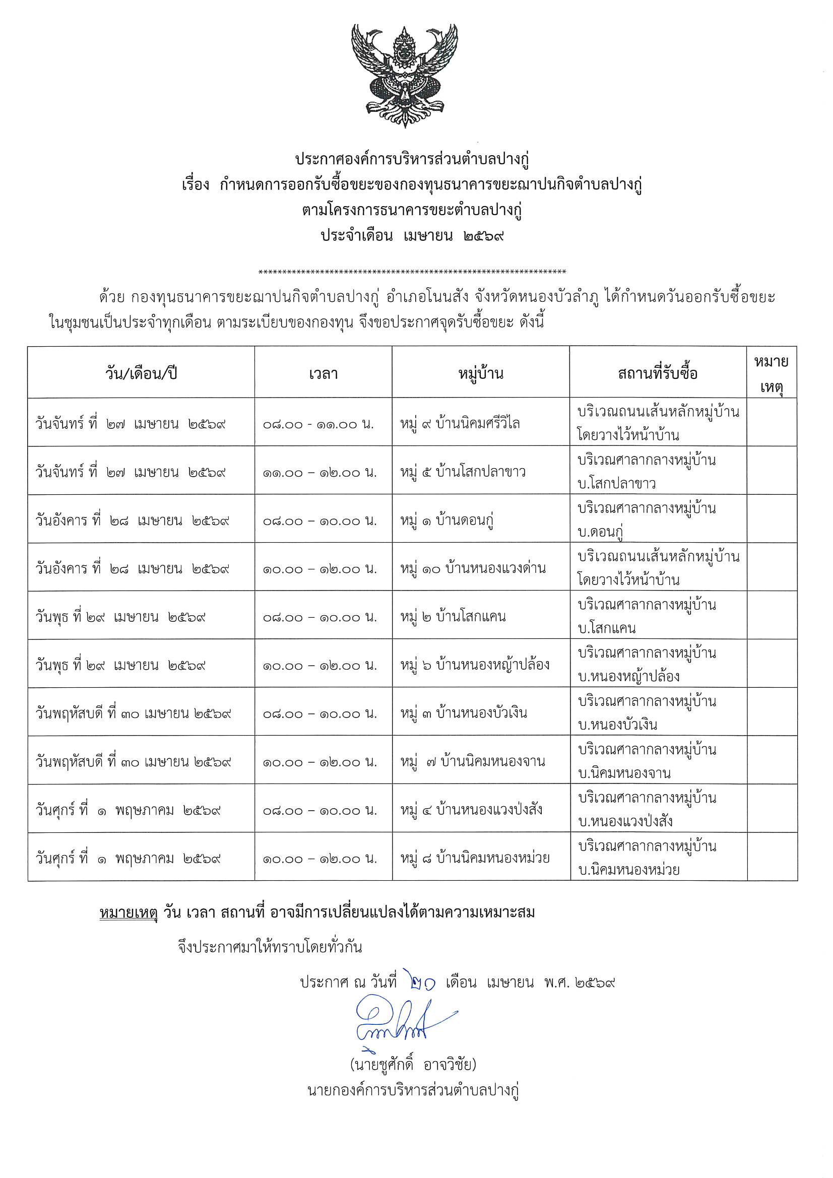ประกาศรับซื้อขยะประจำเดือนเมษายน 2569